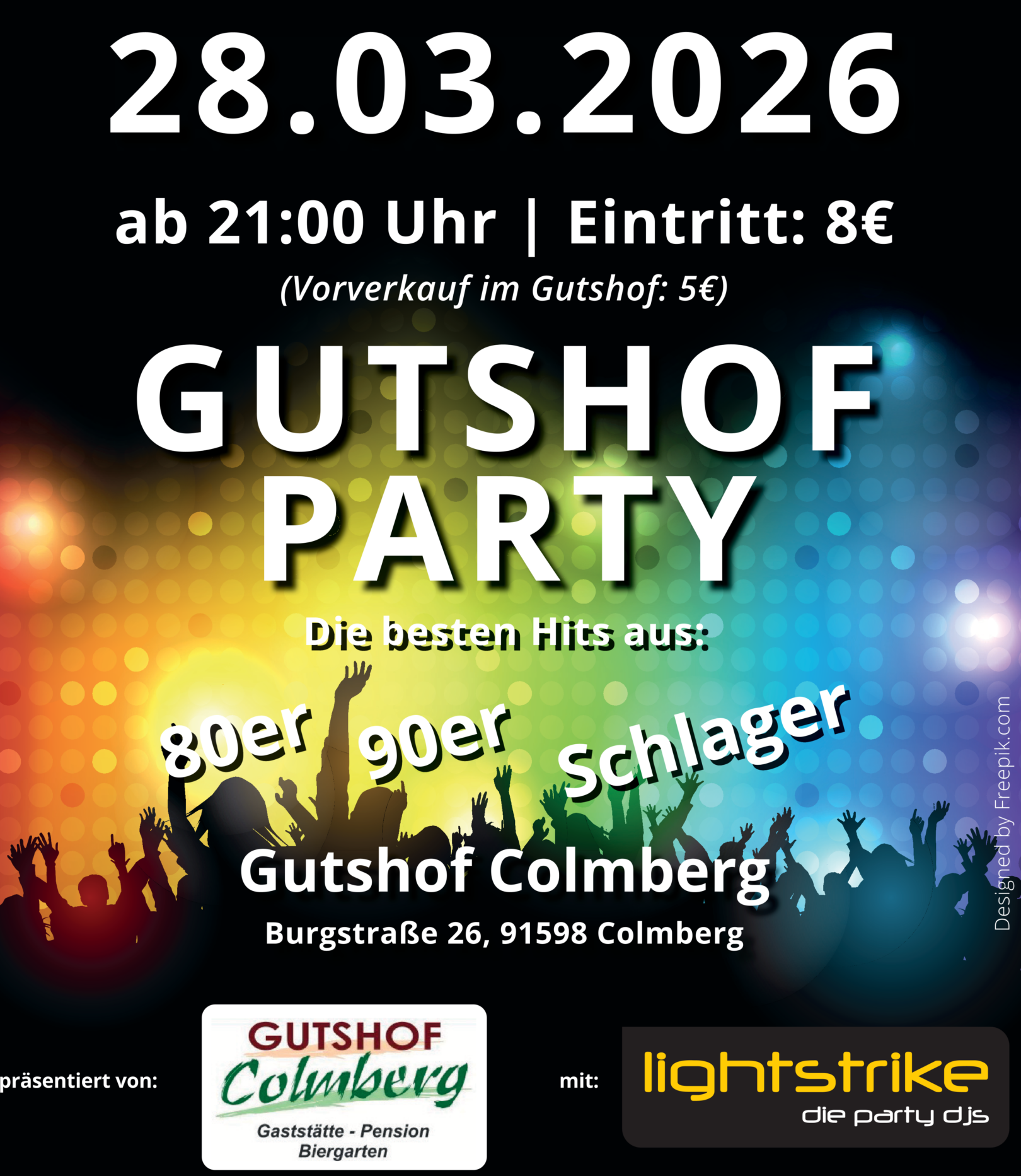 Gutshof‑Party – Die besten Hits aus 80ern, 90ern & Schlager 📅 Datum: 28. März 2026 ⏰ Beginn: ab 21:00 Uhr 💶 Eintritt: 8 € 🎟️ Vorverkauf im Gutshof: 5 € (Abholung vor Ort) Erlebt eine unvergessliche Partynacht im Gutshof Colmberg! Unsere DJs von Lightstrike – die Party DJs bringen die größten Hits der 80er, 90er und die beliebtesten Schlager auf die Tanzfläche. Übernachten zum Spezialpreis – direkt an der Gutshof‑Party Sichern Sie sich Ihr Zimmer auf dem Gutshof und profitieren Sie von unserem exklusiven Sondertarif zur Veranstaltung. Genießen Sie den Abend ohne Zeitdruck und ohne Heimweg, und starten Sie entspannt in den nächsten Tag. Die Zimmeranzahl ist begrenzt – reservieren Sie frühzeitig, um sich diesen Vorteil zu sichern: Zimmer hier Buchen (Eintritt im Zimmerpreis enthalten) Freut euch auf: Beste Stimmung in einzigartiger Gutshof‑Atmosphäre Hits zum Mitsingen und Tanzen Bewirtung und Bar vor Ort DJ‑Show von Lightstrike 📍 Adresse: Gutshof Colmberg Burgstraße 26, 91598 Colmberg